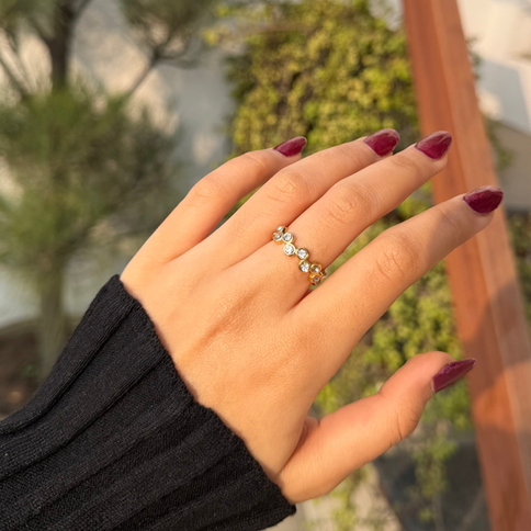 This elegant ring features a delicate row of bezel set clear stones arranged in a soft curved design. It’s perfect for everyday wear or layering with your favourite rings.